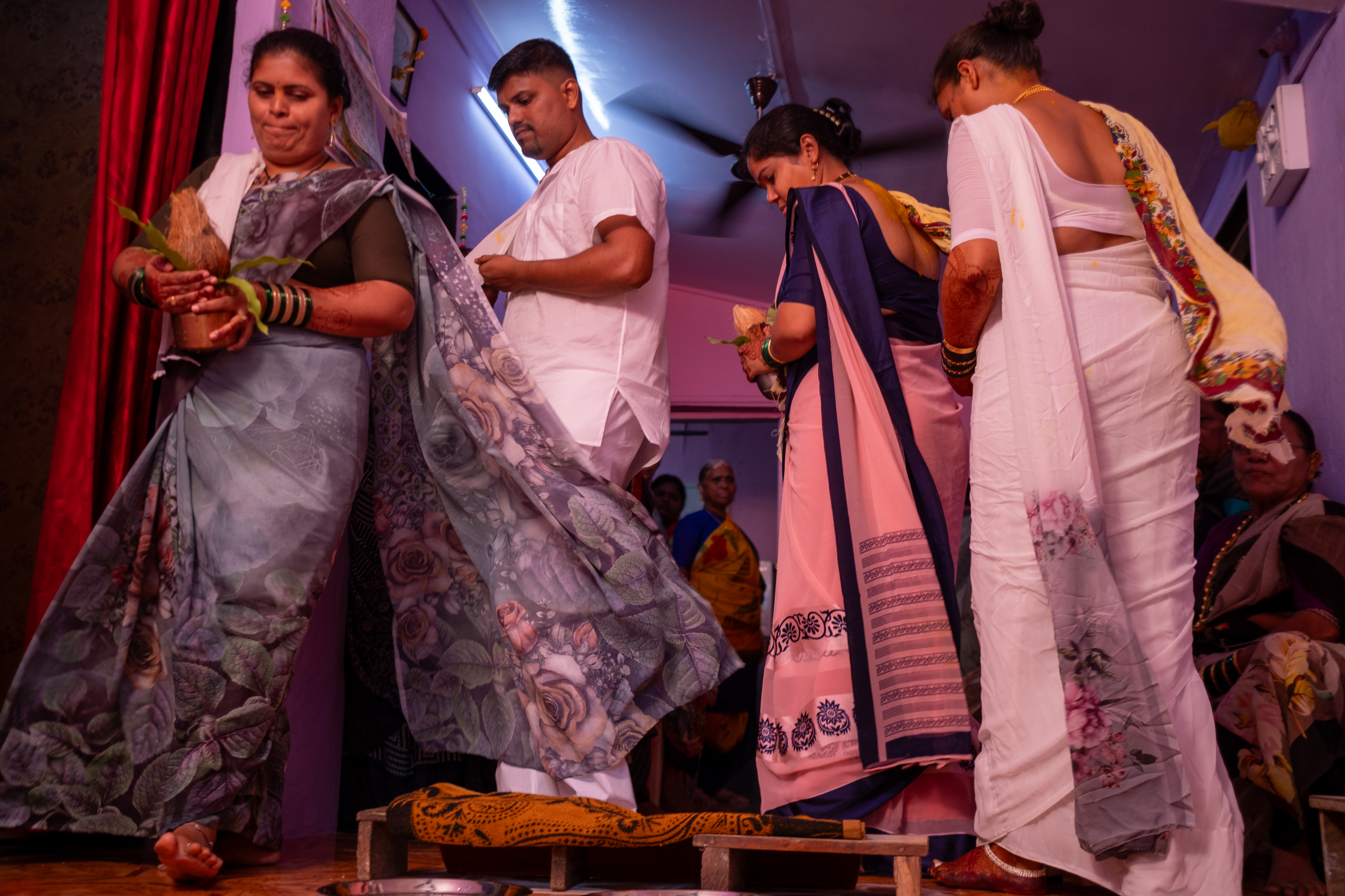 Kelvan, another pre-wedding ritual, follows sakharpuda, in which both families invite the bride and groom to a meal at their respective homes. This ritual also includes offering prayers to their kuladevata (ancestral tutelary deity) to seek blessings.