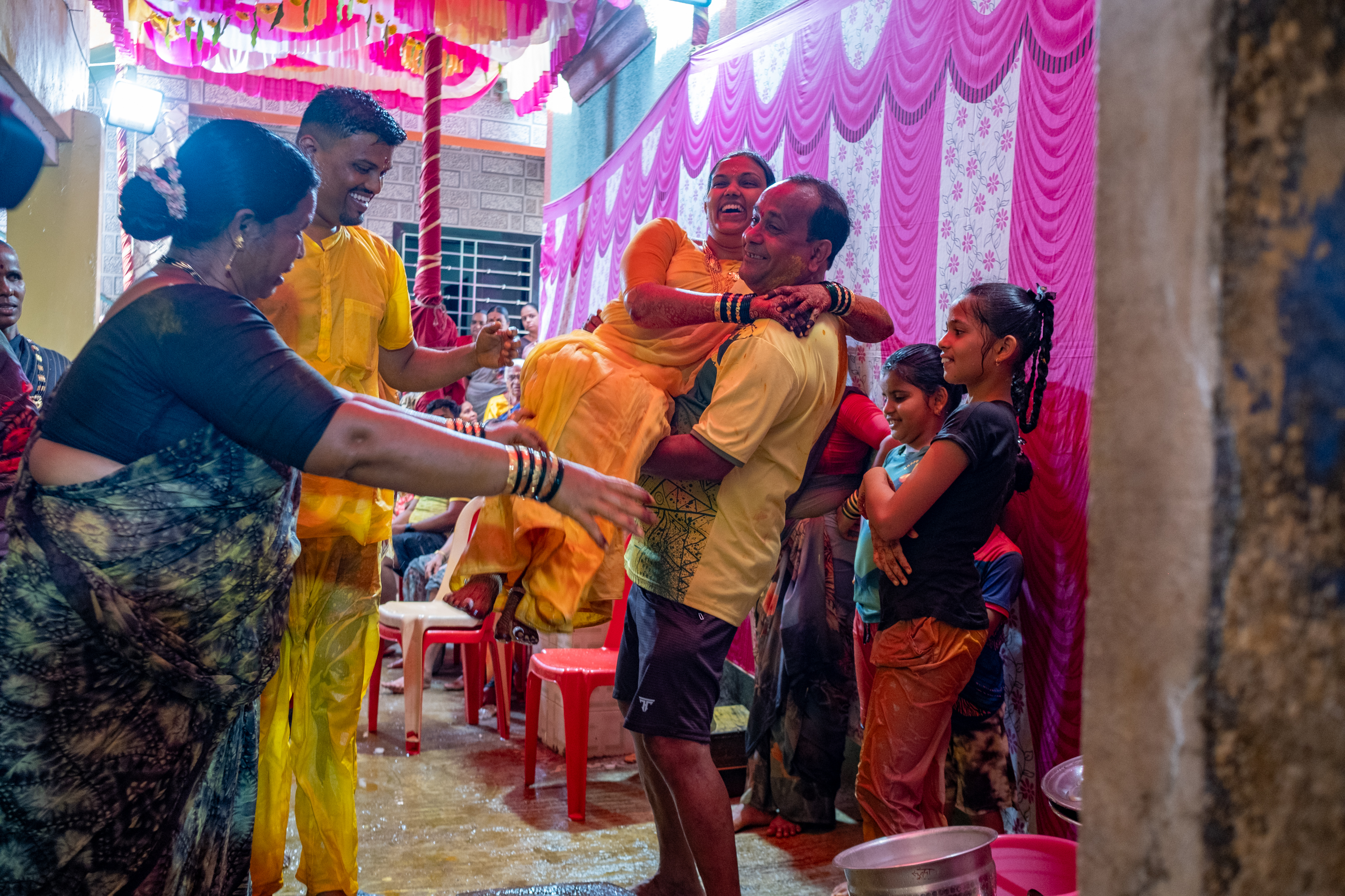 Following the conclusion of the haldi (turmeric) ceremony, the bride's mama (maternal uncle) carries her to the house's threshold.