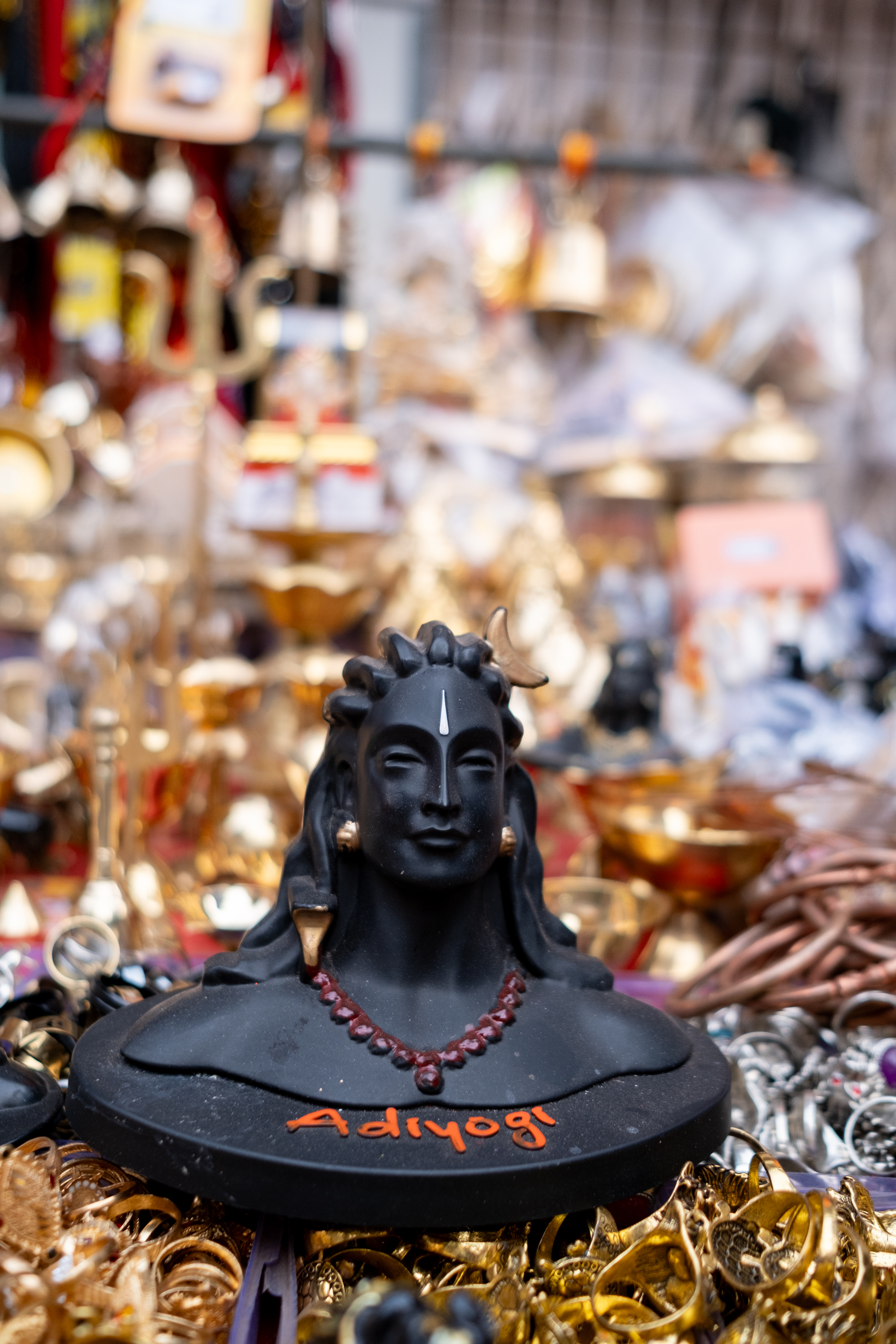 The store sells conches, cowries, rudraksha beads, and metal rings. In the past, people used cowries as a form of currency and associated them with Lakshmi, the Hindu goddess of wealth, fortune, and prosperity.