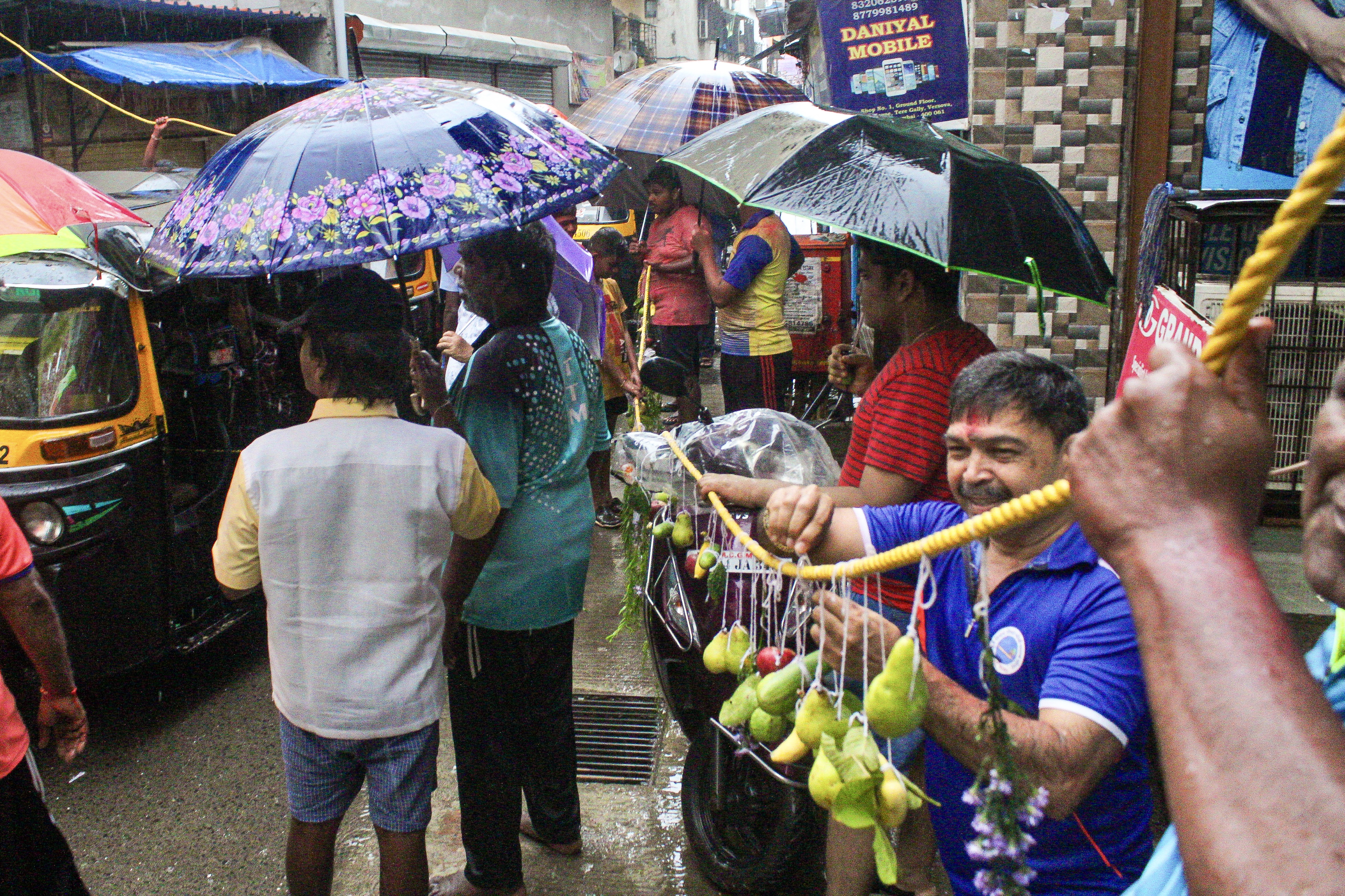 The procession makes its way through the lanes of Versova Koliwada, accompanied by revelry and dancing on the streets. Though organized by the Kolis, people from all communities join the festivities.