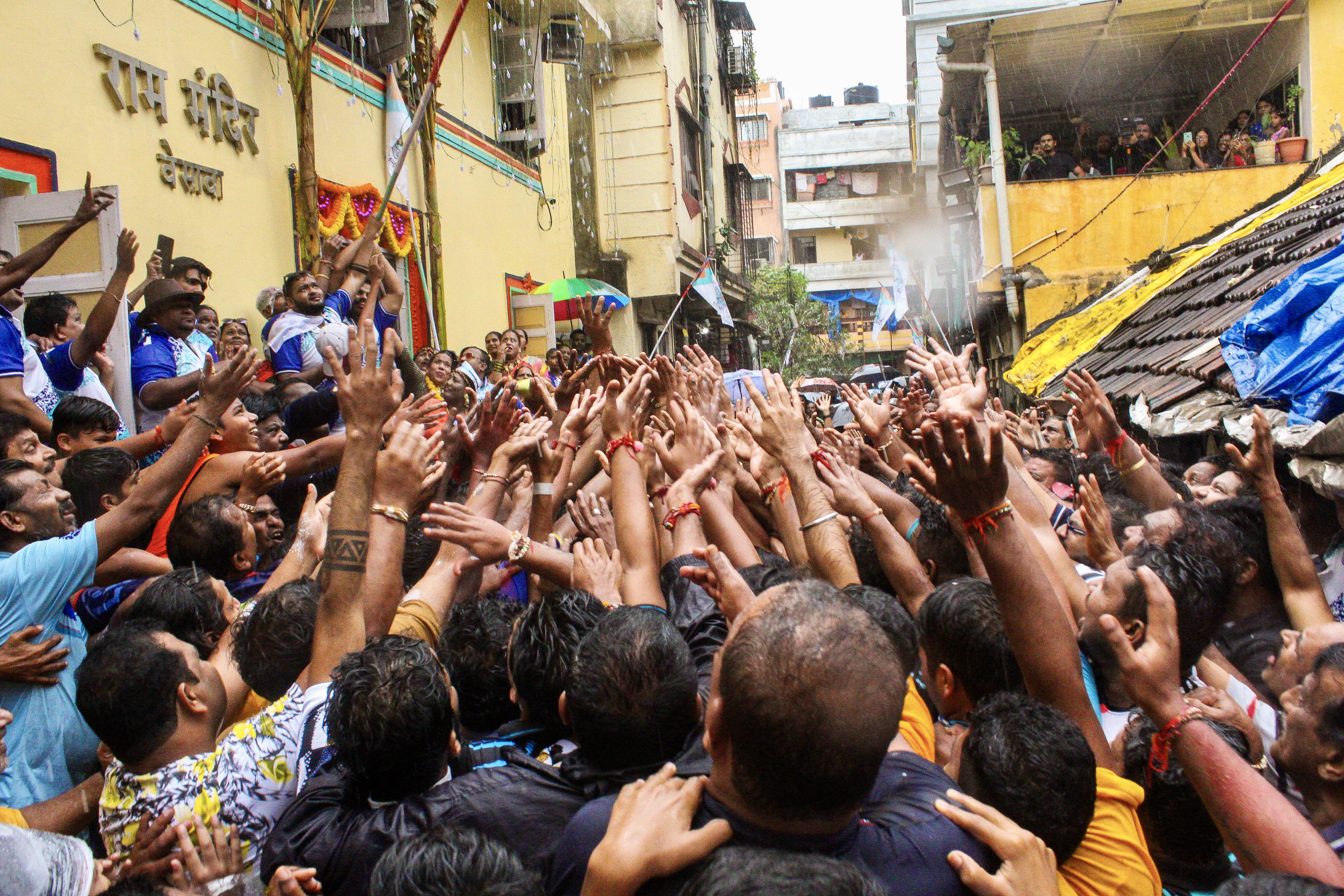 Large crowds assemble at the Ram Temple to participate in the Dahi Handi event. They jostle below the pot in anticipation of the shower of dahi (curd or yoghurt).